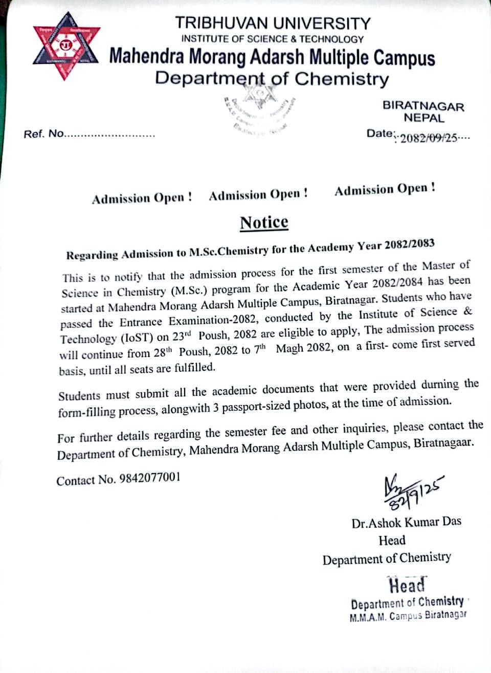 Admission to M. Sc. Chemistry for the Academic Year 2082/2083
