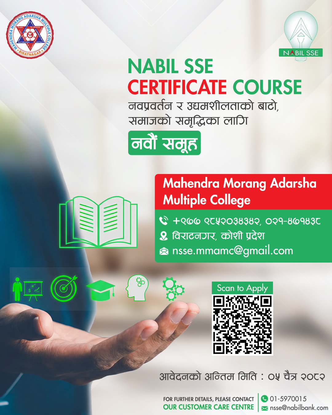 Mahendra Morang Adarsha Multiple College, विराटनगरमा Nabil SSE Certificate Course का लागि आवेदन खुला भइसकेको छ। नयाँ सोचलाई दिशा दिन चाहने, उद्यमशील यात्रामा अघि बढ्न चाहने वा आफ्नै पहलमार्फत समाजमा प्रभाव सिर्जना गरिरहेका व्यक्तिहरूका लागि Nabil SSE Certificate Course मा सहभागी हुन आजै आवेदन दिनुहोस्।