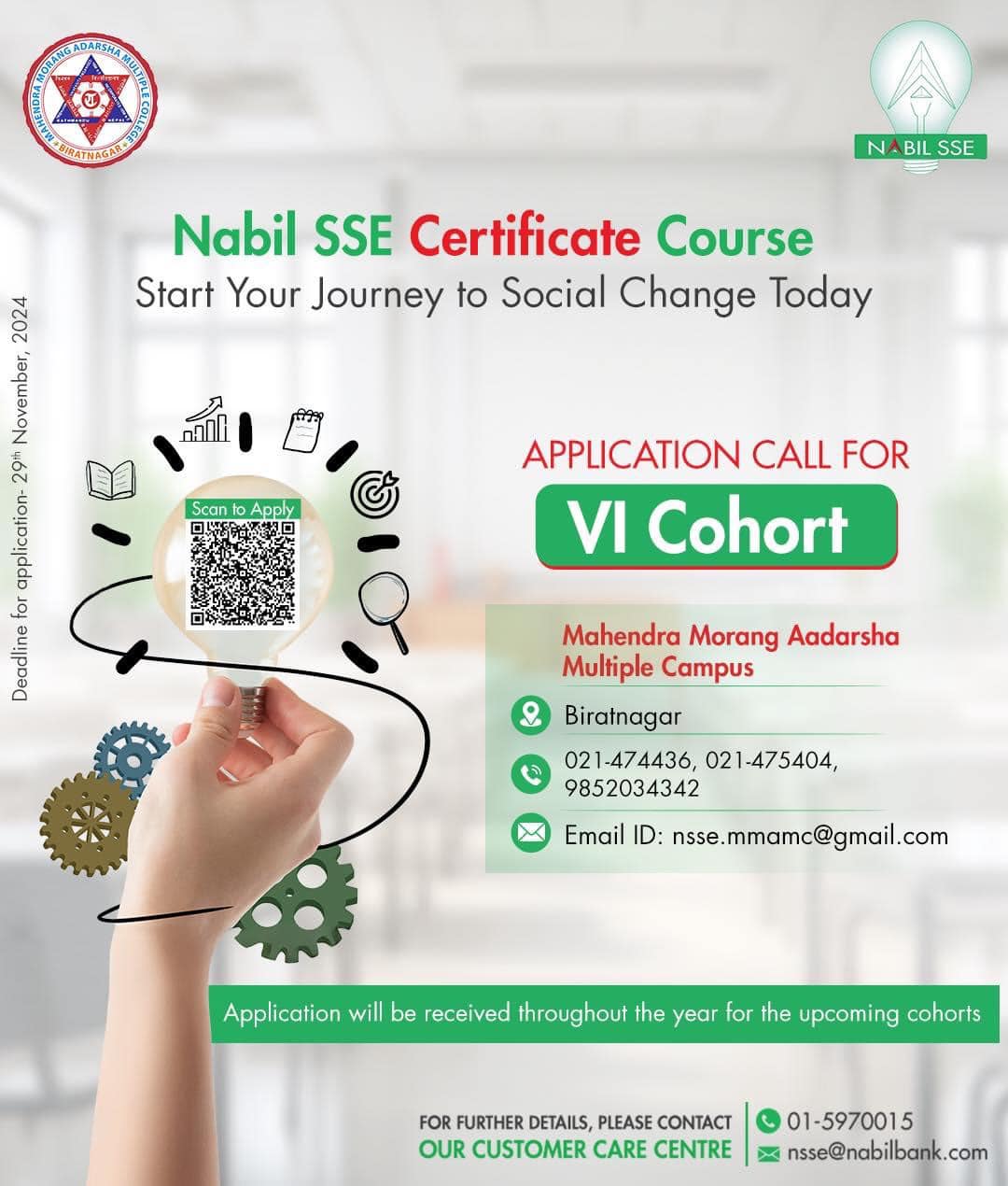 सामाजिक उधमि बन्ने आफ्नो सपनालाई अगाडि बनाउन Nabil SSE सर्टिफिकेट कोर्षको छैठौ ब्याचमा आवेदन दिनुहोस | स्थान : महेन्द्र मोरंग आदर्श बहुमुखी क्याम्पस , विराटनगर | समय : ३ महिना सिट संख्या : २५ मात्र Classes :Every Saturday ( प्रत्येक शनिवार ) Applications are now open for VI cohort! Join the Nabil SSE Certificate Course 2024 at Mahendra Morang Aadarsha Multiple Campus and start your journey to social change.