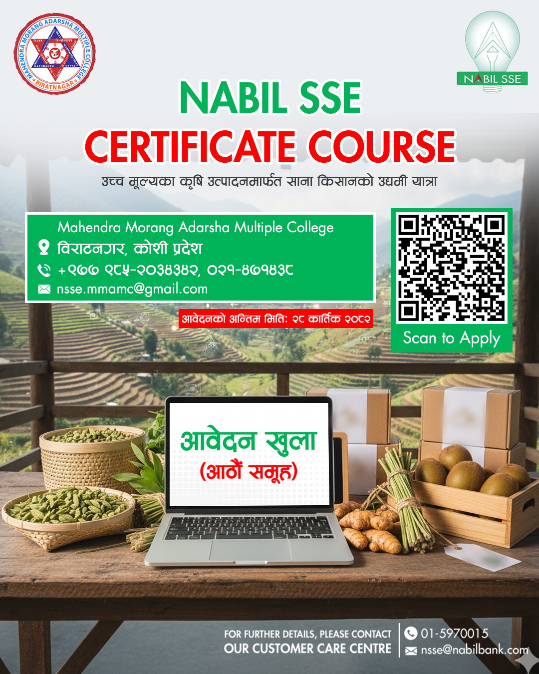 Nabil SSE Certificate Course अब Mahendra Morang Adarsha Multiple College, विराटनगर, कोशी प्रदेशमा हुन गइरहेको छ,जहाँ कृषि क्षेत्रमा आधारित नयाँ विचार र उद्यमशील प्रयासमार्फत समुदायको जीवनस्तर उकास्न चाहने व्यक्तिहरूका लागि अवसर प्रदान गरिन्छ। साथै, गरिबी निवारण तथा वञ्चित समुदायका आवेदकहरूको सहभागितालाई प्राथमिकता दिइनेछ।